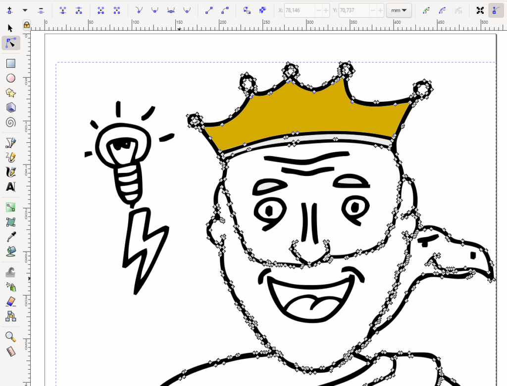 Mit einem solchen Programm zu arbeiten ist etwas ganz anderes als mit meinem Bildbearbeitungsprogramm. Jeder Kreis, jedes Viereck, jede Linie ist in Vektoren aufgeteilt, die aus Start-, Knotenpunkten und Pfaden bestehen. Diese kann man sich anzeigen lassen, sobald man das Vektoren-Icon in der linken Leiste aktiviert und anschließend auf das Element klickt, das man ändern möchte. Nicht erschrecken, das sieht im ersten Moment furchtbarer aus als es ist.