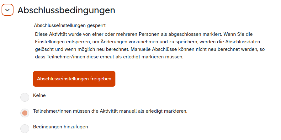 Anmeldung zur Fahrt: Das Dokument dazu war im Kurs einfach als PDF hinterlegt, das ausgedruckt und unterschrieben abgegeben werden musste – eine Unterschrift ist im Jahre 2025 immer noch am meisten wert. Zusätzlich waren die Teilnehmenden jedoch angehalten, die Regeln noch einmal durchzulesen und aktiv durch einen Mausklick zu bestätigen. Dazu wurde das PDF in den Einstellungen mit einer Abschlussbedingung versehen. Über die Option Teilnehmer/innen müssen die Aktivität manuell als erledigt markieren wird jeder Bestätigungsklick automatisch dokumentiert.