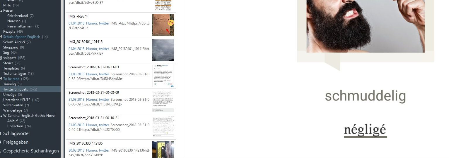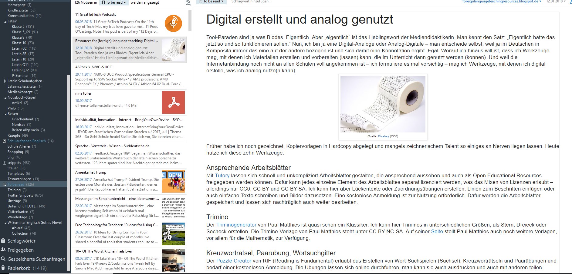 Tweets, die Links zu größeren Artikeln oder Videos haben, finden über einen anderen Umweg ihren Platz in Evernote: Nämlich über den bekannten Webclipper: Dieser ist darauf programmiert, beim Speichern von Seiten und Artikeln einen Großteil des webtypischen Firlefanz wegzulassen, sodass am Ende eigentlich nur der Fließtext mitsamt Bildmaterial zum Lesen übrig bleibt. Sieht damit fast schon wie eine Zeitung aus. Auch dieses Verzeichnis ist über Evernote ständig bei mir, sodass ich darin schmökern kann, wann immer ich Zeit und Lust habe.